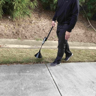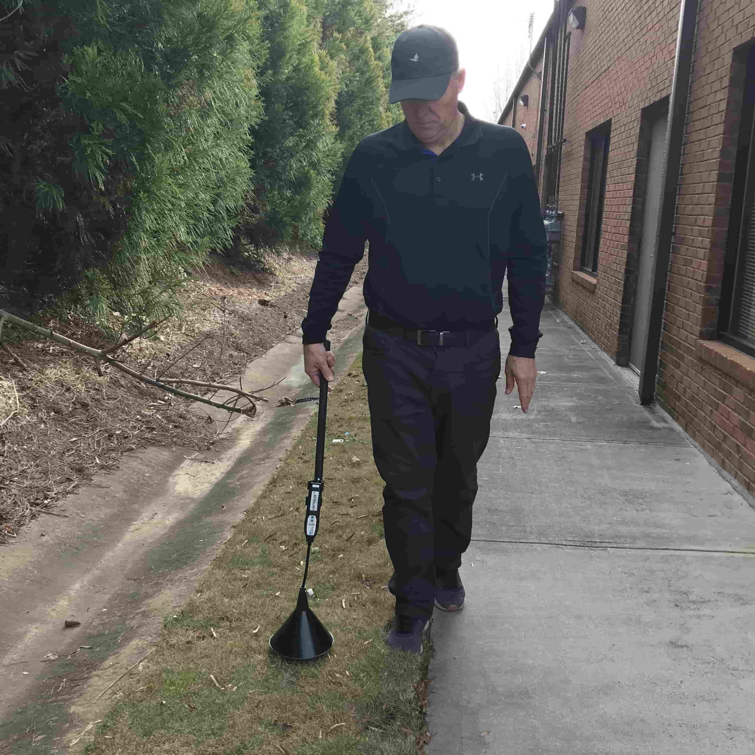 7. If checking above ground or above the pool deck, slowly walk the length of the pipe, keeping the black wind funnel close to the ground and the hydrogen leak detector sensor about 2" above the bottom of the funnel. When the detection sound is heard, mark the leak location at the highest frequency or highest leak rate level.