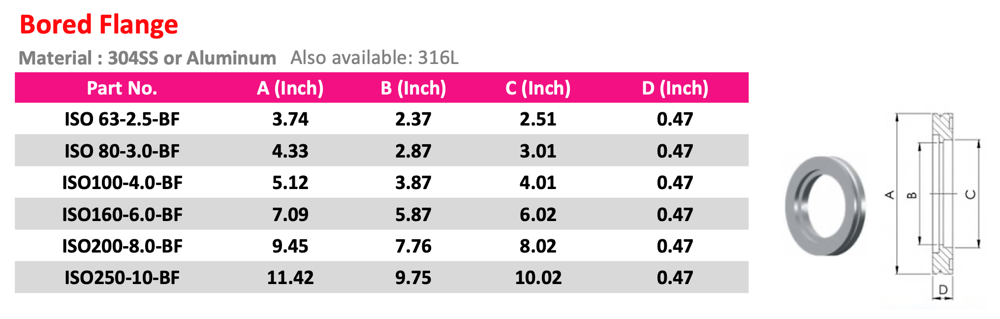 Short Weld Flange with Bore, 304 Stainless Steel. Aluminum or 316SS available upon request. Larger sizes such as ISO320, ISO400 and ISO500 are also available.